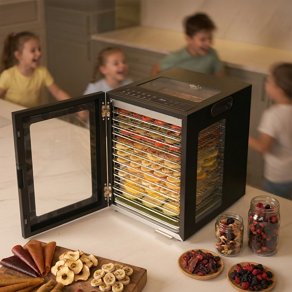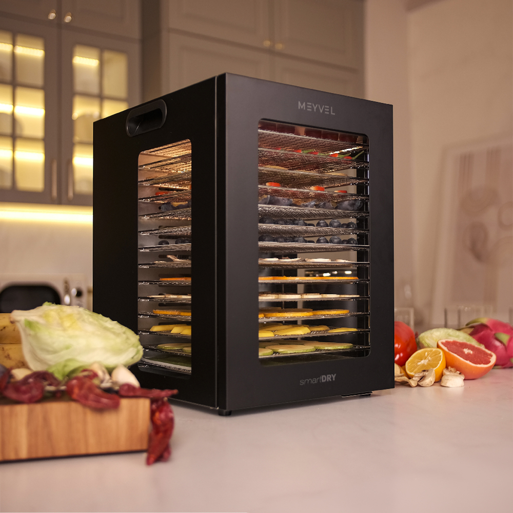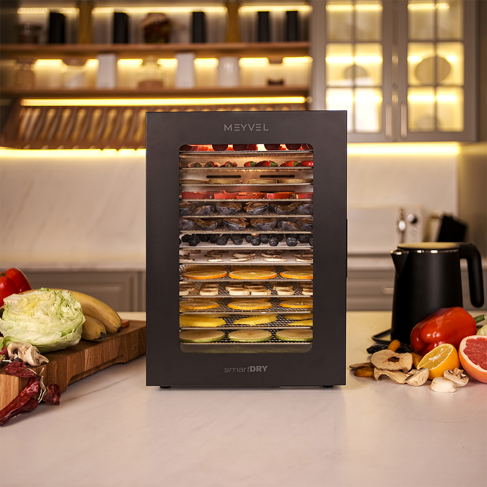 Meyvel MDH14-2S (Black) — это современный дегидратор, который создан для тех, кто хочет заготавливать фрукты, овощи, мясо, травы и ягоды без потери их вкуса и пользы круглый год. Прочный корпус, продуманная конструкция и умная электроника превращают его в надёжного помощника на каждый сезон.