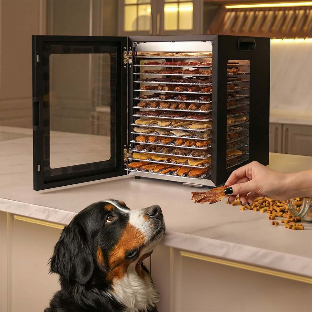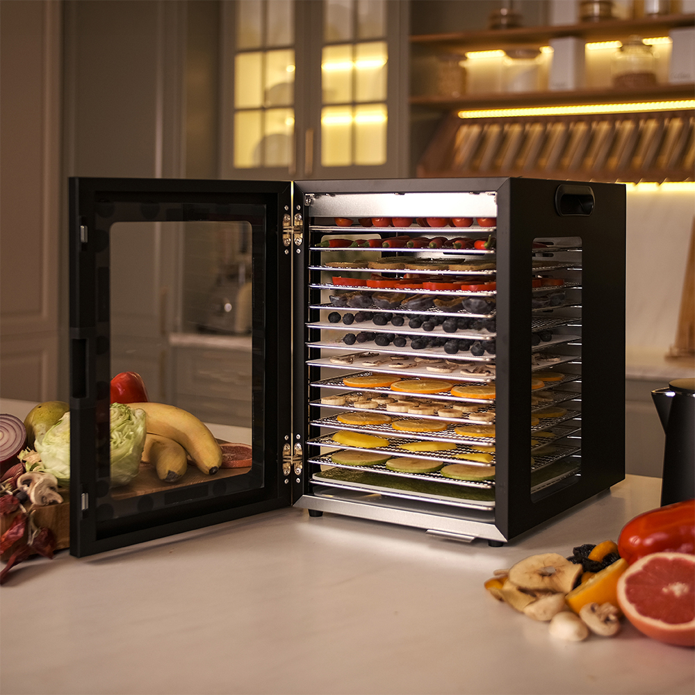 Чёрный корпус из нержавеющей стали, устойчивый к нагреву, влаге и коррозии, выглядит лаконично и современно, легко вписывается в интерьер кухни или мастерской. Внутри установлено 14 поддонов из нержавеющей стали с зазором 25 мм — этого достаточно, чтобы удобно размещать ломтики фруктов, травы или мясные полоски.