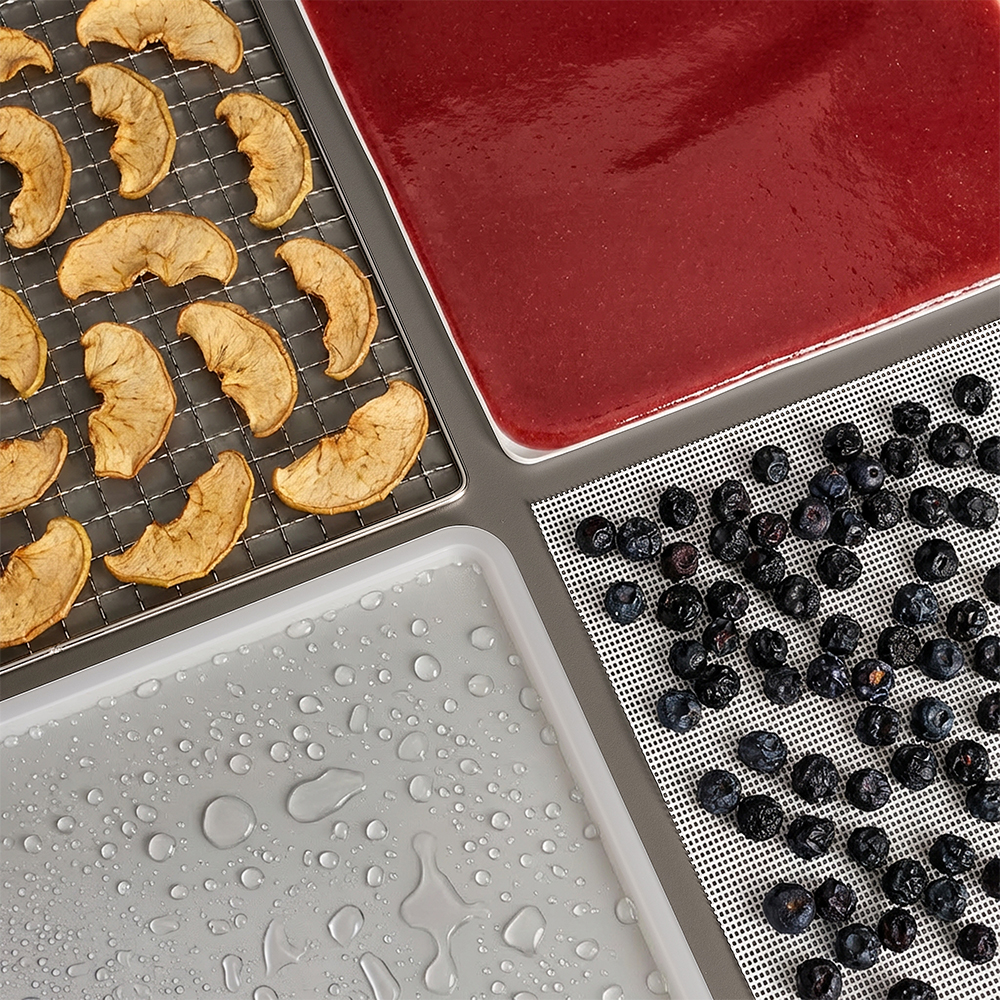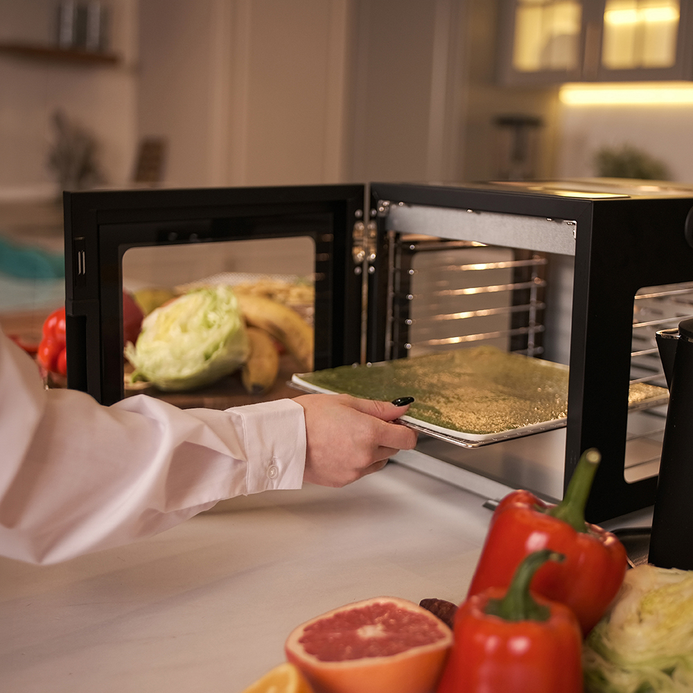 Чёрный корпус из нержавеющей стали, устойчивый к нагреву, влаге и коррозии, выглядит лаконично и современно, легко вписывается в интерьер кухни или мастерской. Внутри установлено 8 поддонов из нержавеющей стали с зазором 25 мм — этого достаточно, чтобы удобно размещать ломтики фруктов, травы или мясные полоски.
