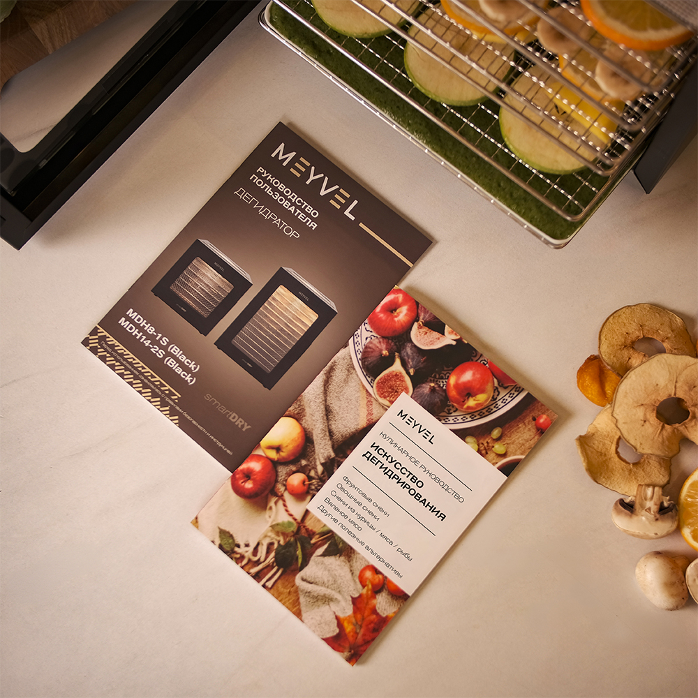 Meyvel MDH8-1S (Black) — это современный дегидратор, который создан для тех, кто хочет заготавливать фрукты, овощи, мясо, травы и ягоды без потери их вкуса и пользы круглый год. Прочный корпус, продуманная конструкция и умная электроника превращают его в надёжного помощника на каждый сезон.