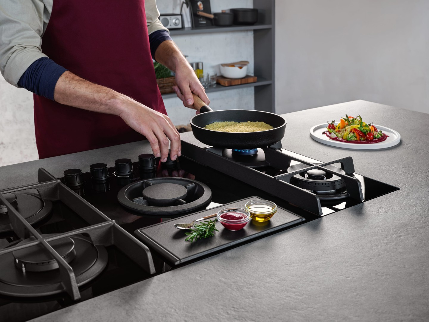 Чугунные элементы сочетают в себе эстетику и функциональность, а крестообразные, закрытые и плоские решетки гарантируют устойчивость кастрюль и сковородок, обеспечивая удобство их перемещения по всей варочной поверхности. Чугунная крышка зоны фильтрации становится оригинальной опорой, опциональная подставка для вока расширяет возможности вариаций приготовления. Встроенная вытяжка очищает воздух от дыма и неприятных запахов автоматически, благодаря комбинированному фильтру для жира, запаха и влаги, обеспечивающему максимальную эффективность и простоту обслуживания.