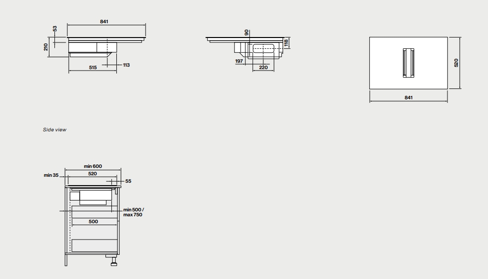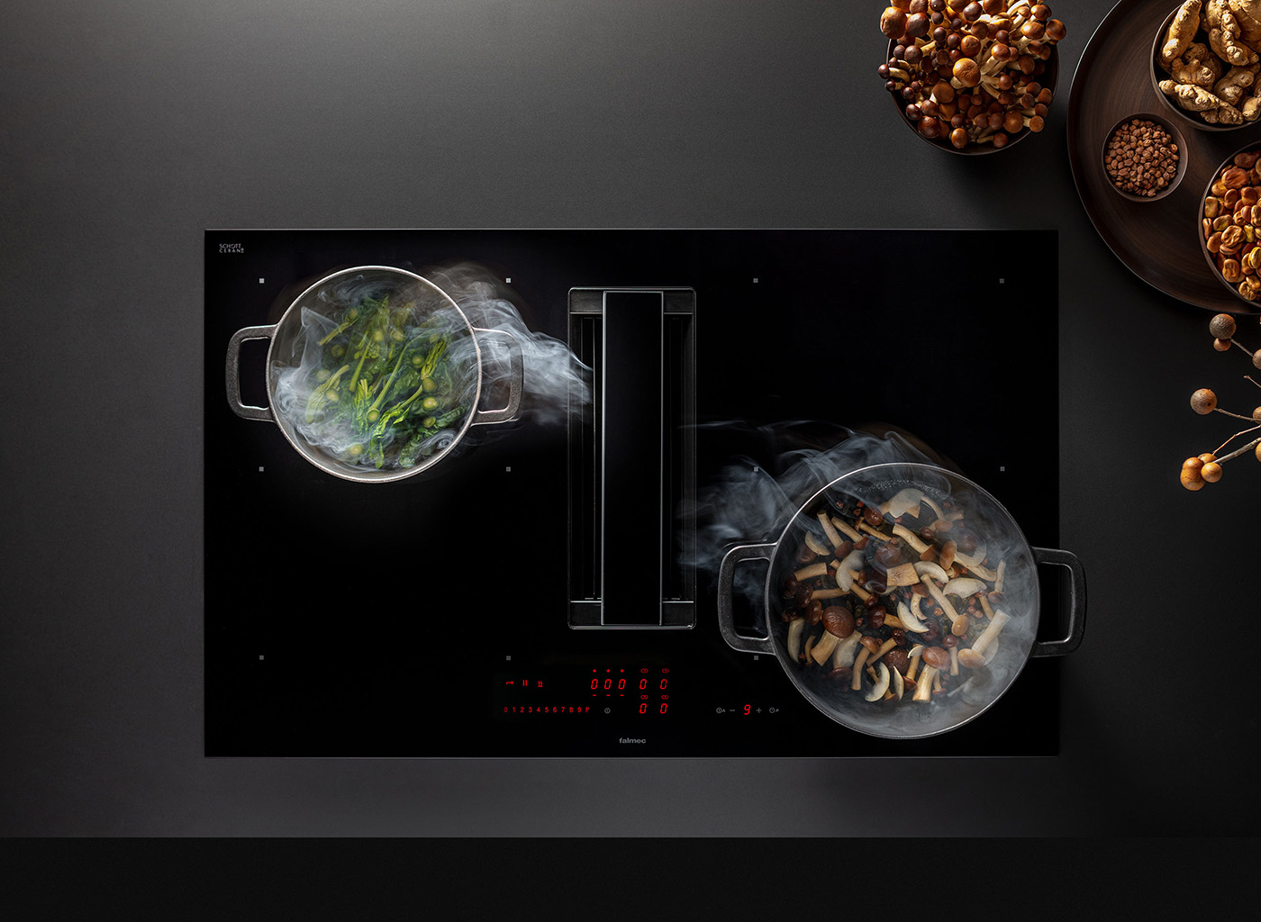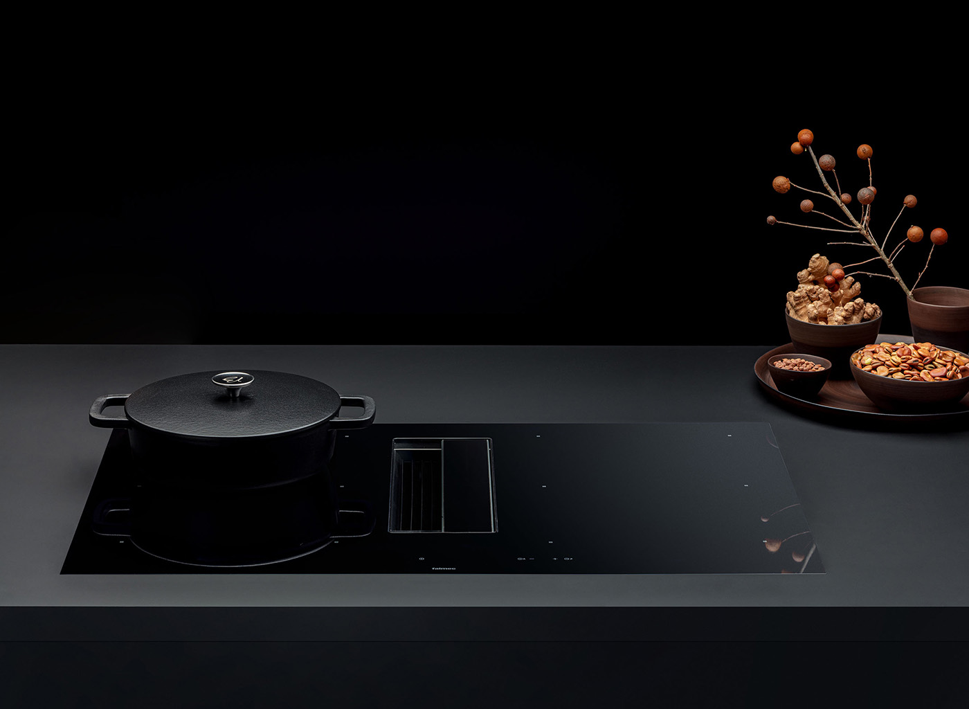 Особенности модели индукционная варочная панель с вытяжкой для режима РЕЦИРКУЛЯЦИИ, восстановление настроек варочной панели в случае случайного выключения, функция поддержания тепла: максимальная температура 70°, 9 уровней приготовления + функция Power (Over Boost), автоматический режим (скорость вытяжки автоматически регулируется в зависимости от мощности приготовления), емкость для сбора жидкости, возможность установки в один уровень со столешницей.